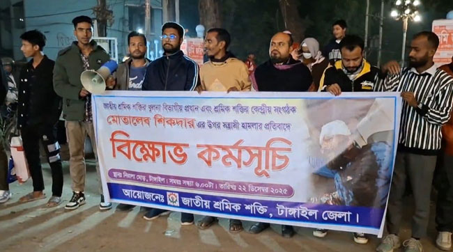 জাতীয় নাগরিক পার্টির (এনসিপি) খুলনা বিভাগীয় প্রধান ও শ্রমিক শক্তির কেন্দ্রীয় সংগঠক মোতালেব শিকদারকে গুলি করার ঘটনার প্রতিবাদে টাঙ্গাইলে বিক্ষোভ কর্মসূচি পালন করেছে টাঙ্গাইল জেলা শ্রমিক শক্তি।