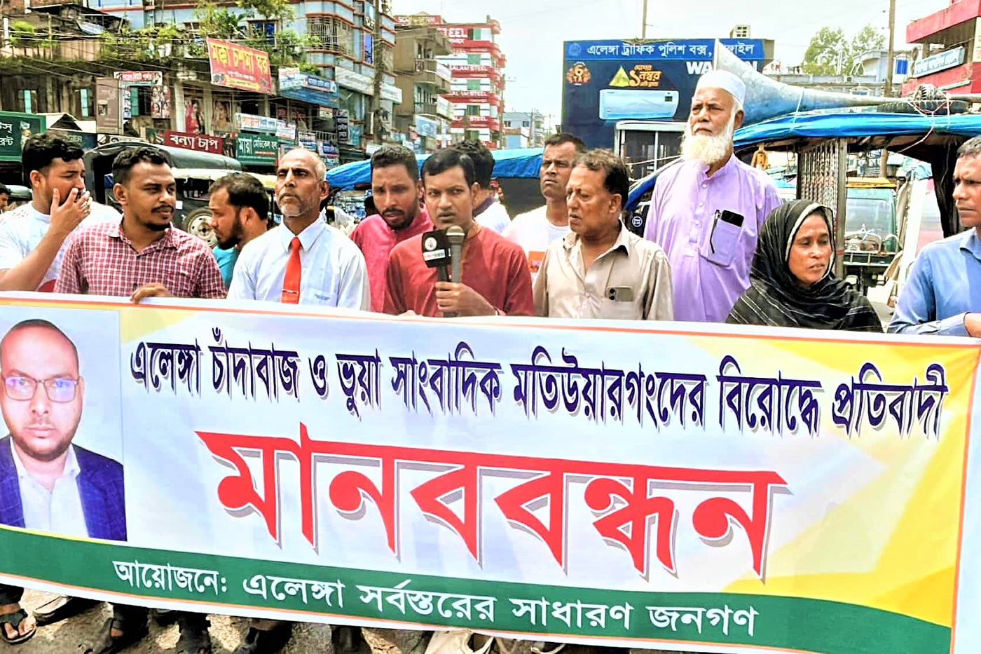 এলেঙ্গায় চাঁ’দা’বা’জি ও ভুয়া সাংবাদিক ও মানব পাচারকারীর বিরুদ্ধে প্রতিবাদ