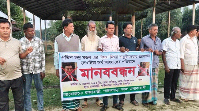 মানববন্ধনে বক্তারা অভিযোগ করেন, পতিশ চন্দ্র মণ্ডল নিজেকে প্রভাবশালী পরিচয় দিয়ে দীর্ঘদিন ধরে সরকারি ও বেসরকারি চাকরির মিথ্যা আশ্বাসে যুবক-যুবতীদের কাছ থেকে বিপুল টাকা হাতিয়ে নিচ্ছেন। প্রতারণার শিকার ভুক্তভোগীরা টাকা ফেরত চাইলে নানা অজুহাতে তিনি সময়ক্ষেপণ করছেন এবং কেউ কেউ হুমকিরও শিকার হয়েছেন বলে অভিযোগ উঠেছে।