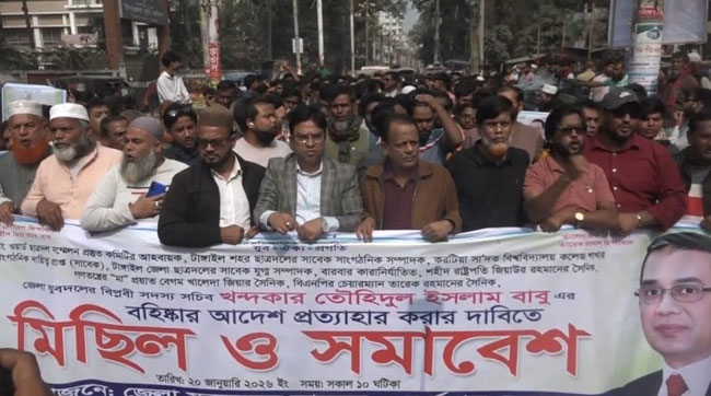 টাঙ্গাইল জেলা যুবদলের সদস্য সচিব খন্দকার তৌহিদুল ইসলাম বাবুর বহিষ্কারের আদেশ প্রত্যাহারের দাবিতে বিক্ষোভ মিছিল ও সমাবেশ অনুষ্ঠিত হয়েছে। মঙ্গলবার দুপুরে জেলা যুবদলের সাবেক ও বর্তমান নেতৃবৃন্দের উদ্যোগে শহরের শহীদ স্মৃতি পৌর উদ্যান থেকে মিছিল বের হয়। মিছিলটি শহরের গুরুত্বপূর্ণ সড়ক প্রদক্ষিণ করে শহীদ মিনারে এসে সমাবেশ মিলিত হয়।