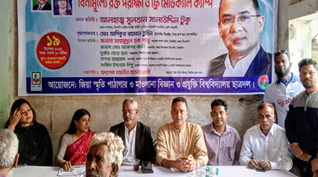 টাঙ্গাইল পৌর শহরের সন্তোষ এলাকার মাদারখোলায় বিনামূল্যে রক্ত পরীক্ষা ও ফ্রি মেডিকেল ক্যাম্প অনুষ্ঠিত হয়েছে। শুক্রবার (১৯ ডিসেম্বর) দিনব্যাপী এই মেডিকেল ক্যাম্পের আয়োজন করে জিয়া স্মৃতি পাঠাগার এবং মাওলানা ভাসানী বিজ্ঞান ও প্রযুক্তি বিশ্ববিদ্যালয় শাখা ছাত্রদল।