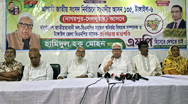 দেলদুয়ার উপজেলা বিএনপি ও উপজেলার সাধারণ জনগণের আকুণ্ঠ সমর্থন ও তাদের দাবির প্রেক্ষিতে আসন্ন জাতীয় সংসদ নির্বাচনে টাঙ্গাইল-৬ (দেলদুয়ার-নাগরপুর) আসনে প্রার্থীতা ঘোষনা করলেন জেলা বিএনপির প্রতিষ্ঠাতা সভাপতি হামিদুল হক মোহন। শনিবার বিকেলে টাঙ্গাইল প্রেসক্লাবে সংবাদ সম্মেলন করে প্রার্থীতা ঘোষণা করে এ তথ্য নিশ্চিত করেছেন হামিদুল হক মোহনসহ দেলদুয়ার উপজেলা বিএনপির নেতাকর্মীরা।