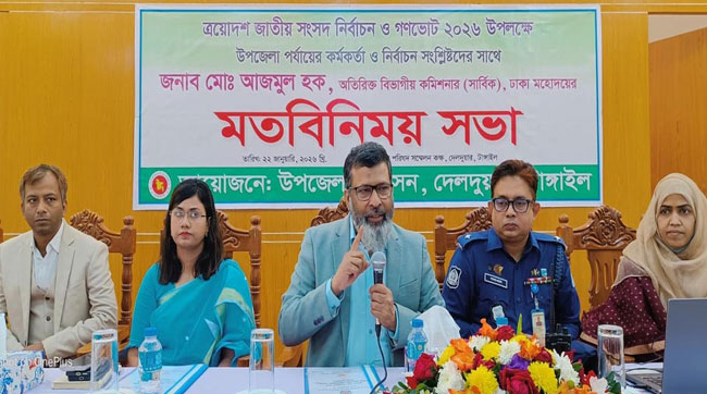টাঙ্গাইলের দেলদুয়ারে ত্রয়োদশ জাতীয় সংসদ নির্বাচন ও গণভোট ২০২৬ এর প্রস্তুতি নিয়ে উপজেলা পর্যায়ের কর্মকর্তা ও নির্বাচন সংশ্লিষ্টদের সঙ্গে মতবিনিময় সভা অনুষ্ঠিত হয়েছে। বৃহস্পতিবার (২২ জানুয়ারি) বেলা ১১টায় উপজেলা পরিষদ সম্মেলন কক্ষে এ সভা অনুষ্ঠিত হয়।