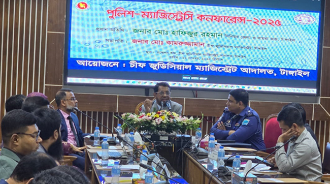 টাঙ্গাইলের চীফ জুডিশিয়াল ম্যাজিস্ট্রেট কোর্টে পুলিশ-ম্যাজিস্ট্রেসি কনফারেন্স-২০২৫ অনুষ্ঠিত হয়েছে। শনিবার (২২ নভেম্বর) ম্যাজিস্ট্রেট কোর্টের সম্মেলন কক্ষে আয়োজিত কনফারেন্সে সভাপতিত্ব করেন টাঙ্গাইলের চীফ জুডিসিয়াল ম্যাজিস্ট্রেট মো. কামরুজ্জামান।